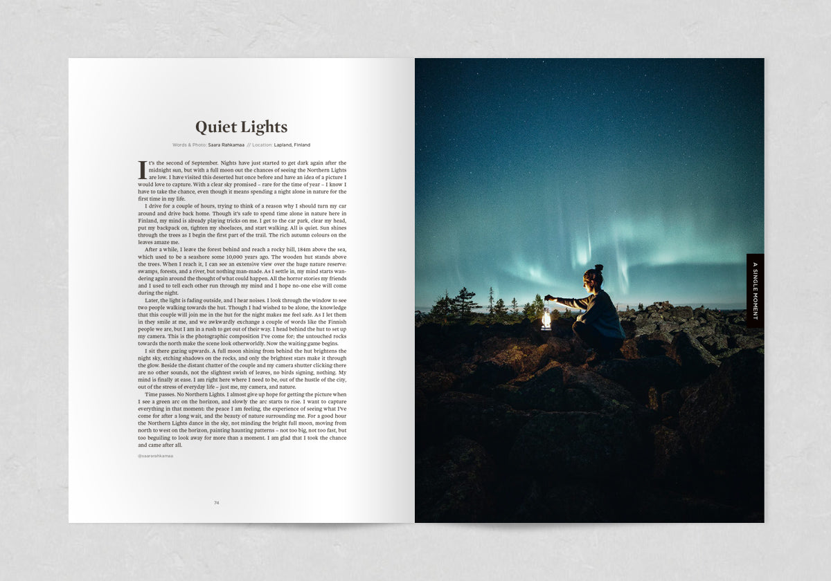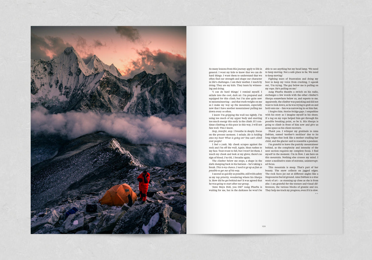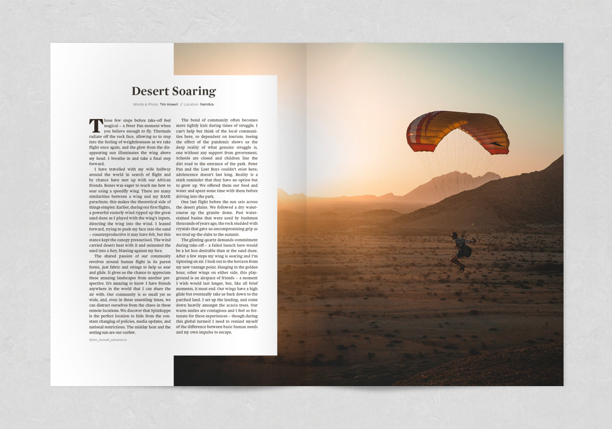 Hannes Becker finds reconnection in a land of big skies, rugged coasts, and warm hearts. Nimsdai Purja defies expectations to summit K2 in winter with an all-Nepali team. On the Mentawai Islands, Iñigo Grasset glimpses a way of life completely untouched by the pandemic sweeping the world whilst Sofía Mejía Llamas finds silence on skis in Japan. In Peru, Fredrika Ek hallucinates while trying to ride a high-altitude pass whilst, Peter Mather's five-year quest to photograph the legendary Ice Bears of the Yukon is an adventure of a different kind – one of patience, diligence, and respect.